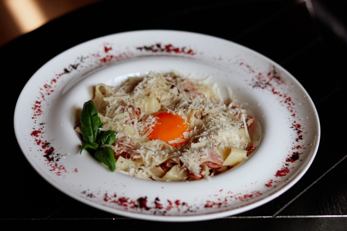 Класична карбонара: тальятеле з беконом, цибулею-пореєм, вершками, яйцями та пармезаном, злегка доповнена соєвим соусом і часниковим маслом.