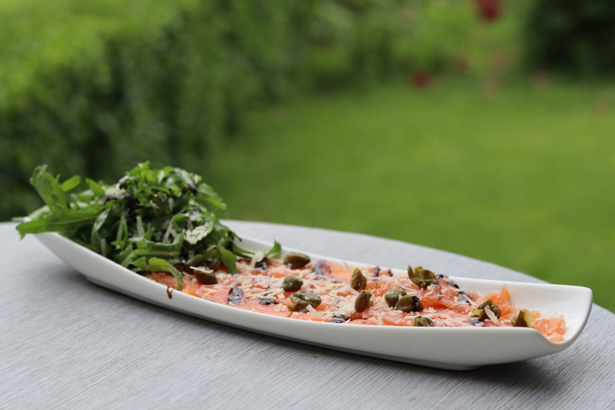 Ніжний слабосолений лосось з пармезаном, соусом унагі, в’яленим помідором та каперсами. Вага 160 г.