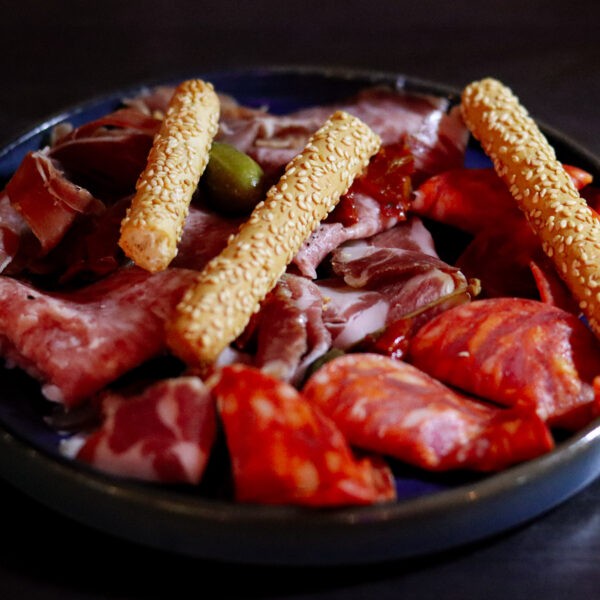 Вибір італійських делікатесів: салямі Наполі та Мілано, чорізо, шинка та прошуто. Подається з в’яленими томатами, оливками, каперсами та грісіні.