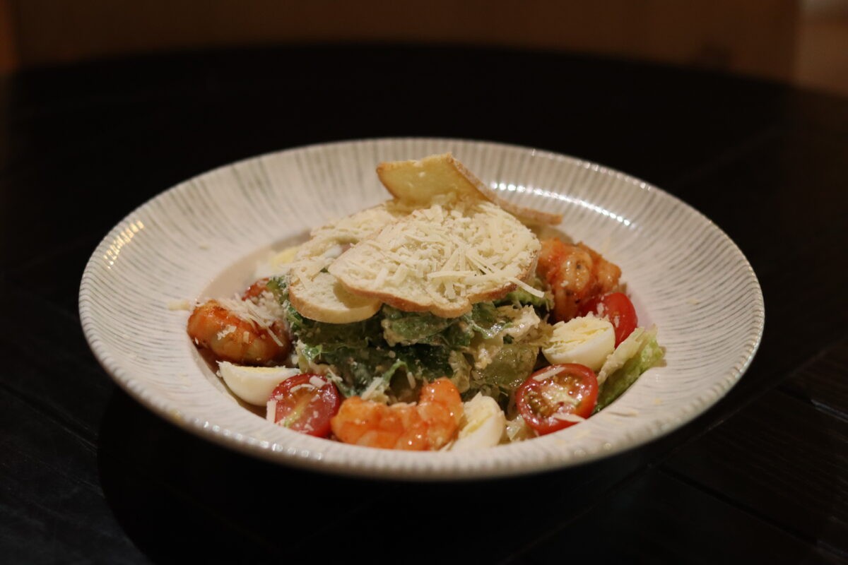 Тигрові креветки з салатом ромен та айсбергом, перепелиними яйцями, чері, пармезаном і грінками чіабата під фірмовим соусом Цезар. Вага 220 г.