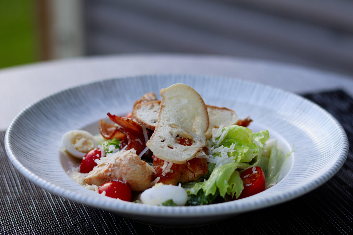 Класичний салат із курячим філе, хрустким беконом, томатами чері, перепелиними яйцями, айсбергом і роменом, пармезаном та грінками чіабата під соусом Цезар.