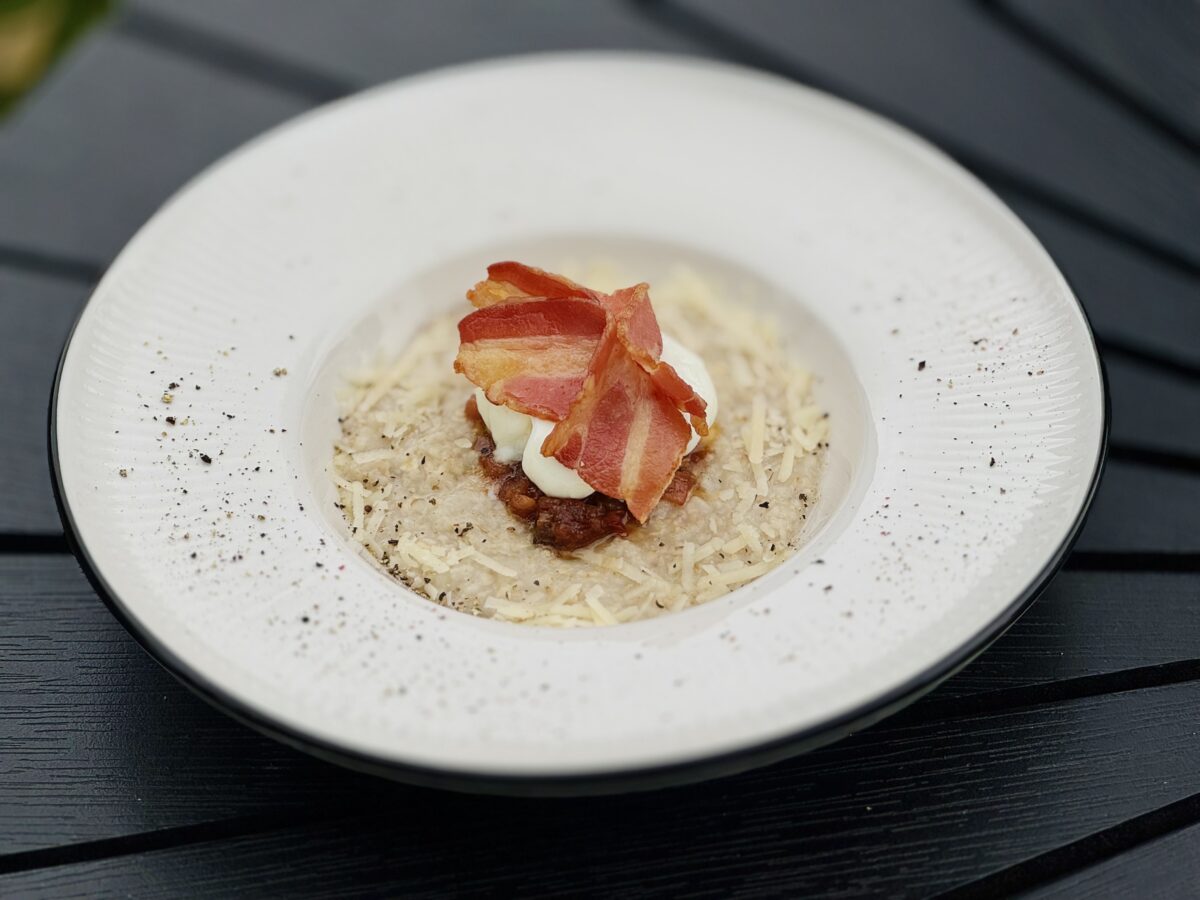 Вівсянка з яйцем пашот, беконом та пармезаном