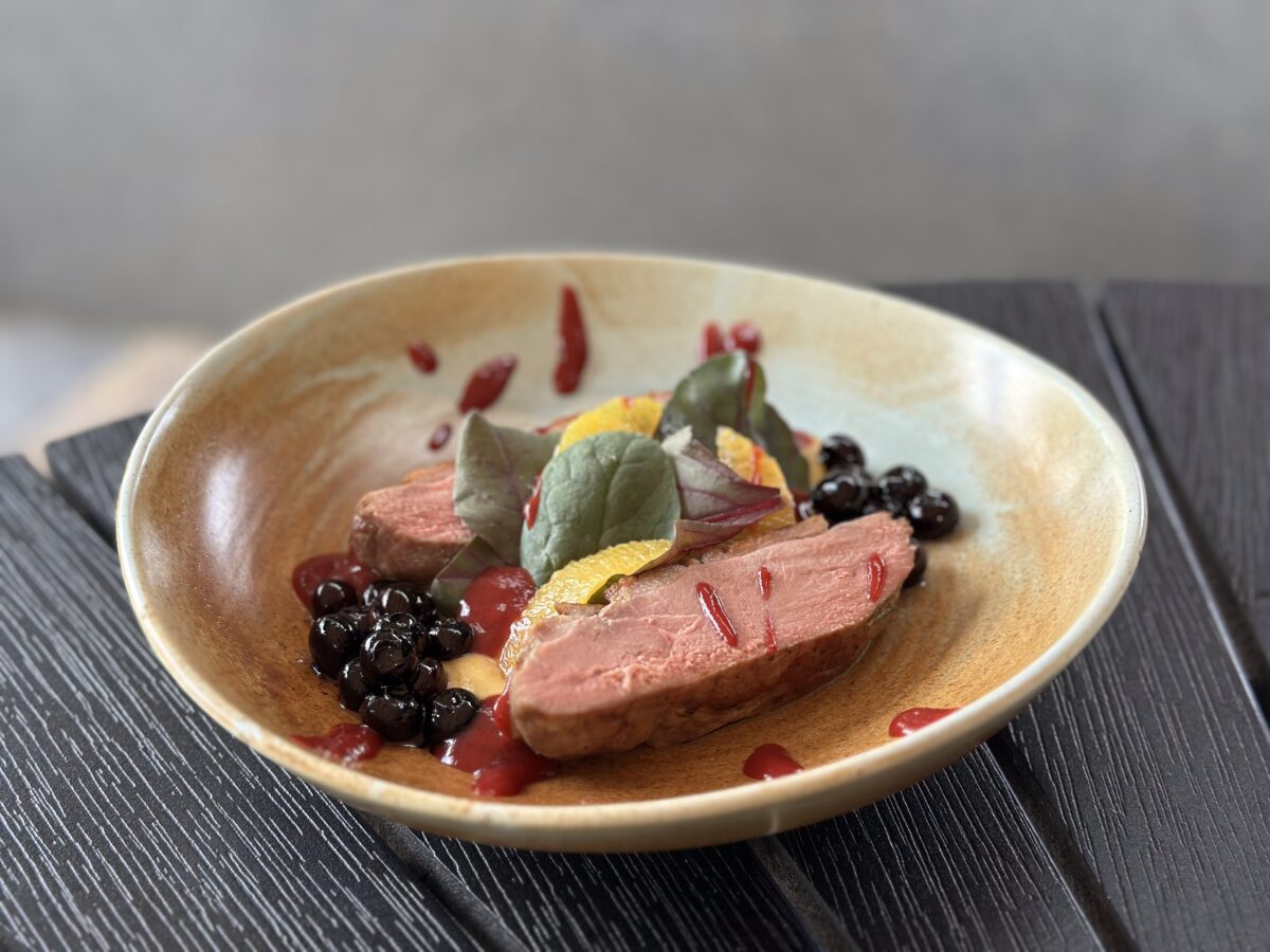 Соковите качине філе з карамельно-яблучним мусом, доповнене ніжними дольками апельсина, свіжою чорницею та ягідним соусом кюлі