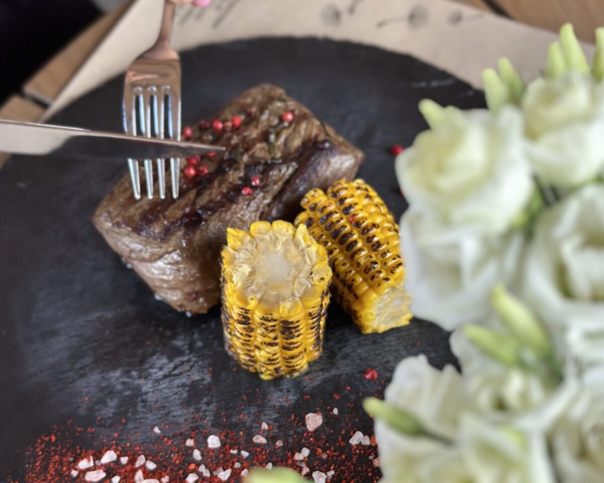 Ніжне філе міньйон ідеальної прожарки, подається з солодкими смаженими шматочками кукурудзи
