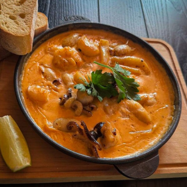 555 грнБейбі кальмар, каракатиця, восьминіг і креветки у пікантному вершково-хойсіновому соусі з нотками лайма