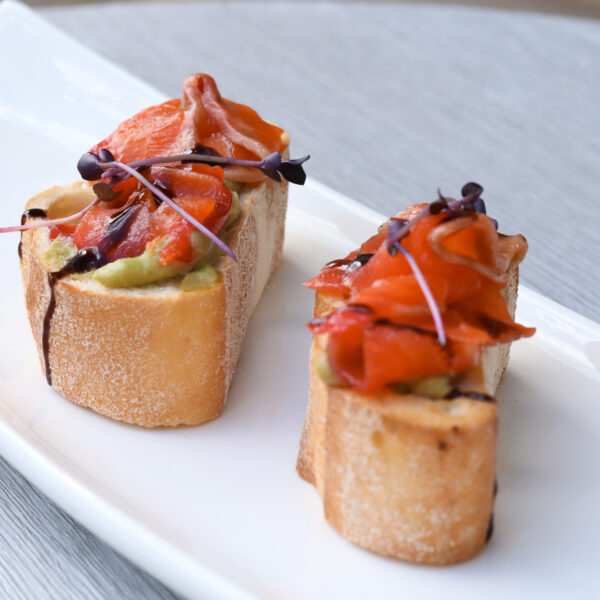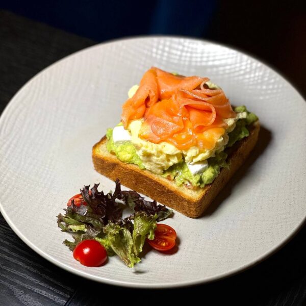 Хрустка чіабата з гуакамоле, свіжим огірком і слабосолоним лососем, доповнена мікрогріном і кремом бальзаміку. Вага 110 г.