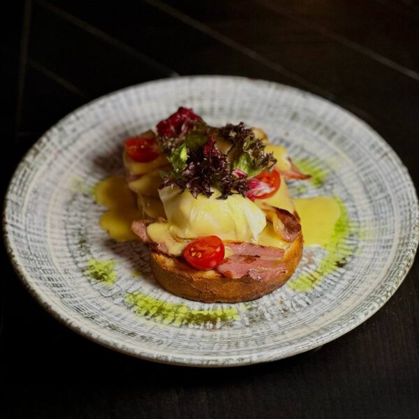 Яйця пашот на пухкому бріоші з ніжним крем-сиром, слабосолоним лососем, соковитими чері та лоло-салатом, доповнені вершковим соусом Голландез. Вага 220 г.