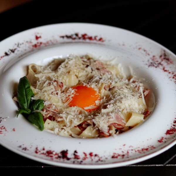 Класична карбонара: тальятеле з беконом, цибулею-пореєм, вершками, яйцями та пармезаном, злегка доповнена соєвим соусом і часниковим маслом.
