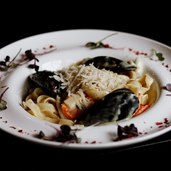 Тальятеле у вершковому соусі з тигровими креветками, мідіями, кальмарами та пармезаном.